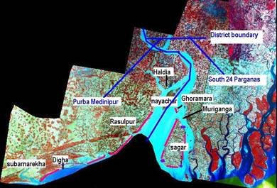 1. The macro tidal (tidal range > 4 m) Hugli estuarine plain characterized by a network of creeks encompassing the islands with spectacular mangrove vegetation and off-shore linear tidal shoals from Sagar Islnd to the border of Bangladesh to the east.